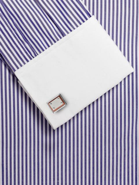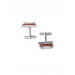 Steel coloured pair of cuff-links with brown woody edge detail; rectangular
