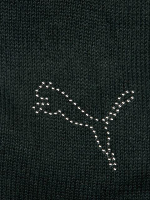 This long slim black scarf from puma is made of 80% acrylic and 20% cotton to offer maximum warmth and softness. The tight knit fabric in a double layer provides thermal protection when the weather turns cold. Your Sports-brand allegiance is subtly displayed by the puma logo picked out with silver coloured studs.