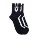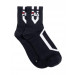 Dark blue socks with branding at mouth, 360 degree contouring at heel and toe for durability and comfort, soft grip at cuffs leaves no marks, fine flat toe seam prevents irritation, left and right foot specific socks to ensure an anatomical fit