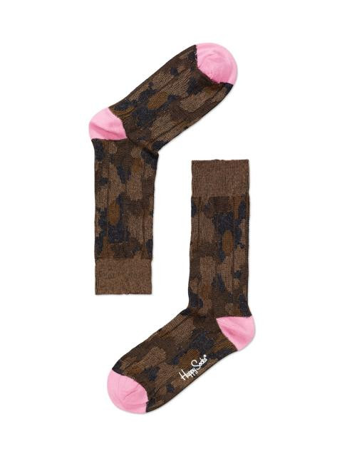 Brown patterned socks with an elasticated cuff, pink, reinforced toe and heel region for durability