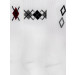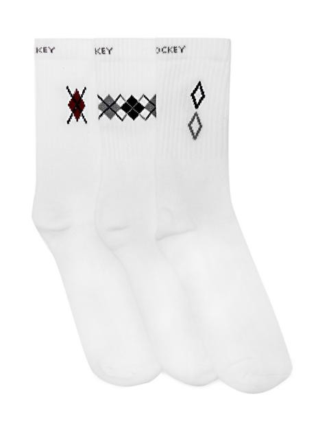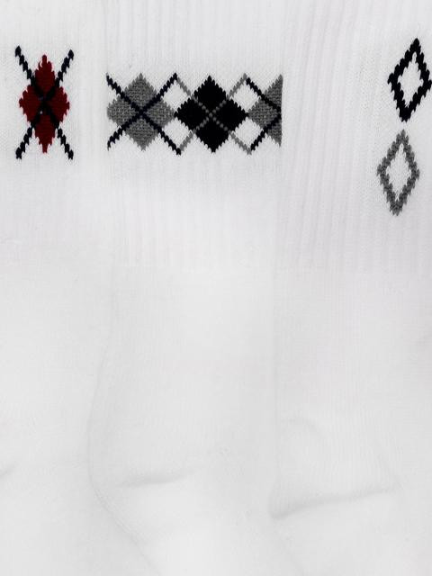 White socks with different coloured, knitted patterns, has an elastane welt for firm 'no sag' grip, terry lining inside for superior cushioning and absorbency, above ankle length and comfort toe socks