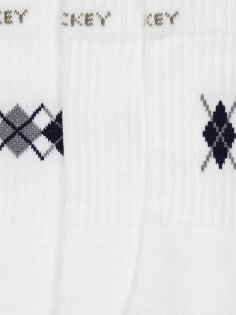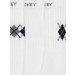 White socks with different coloured, knitted patterns, has an elastane welt for firm 'no sag' grip with branding on it , terry lining inside for superior cushioning and absorbency, above ankle length and comfort toe socks