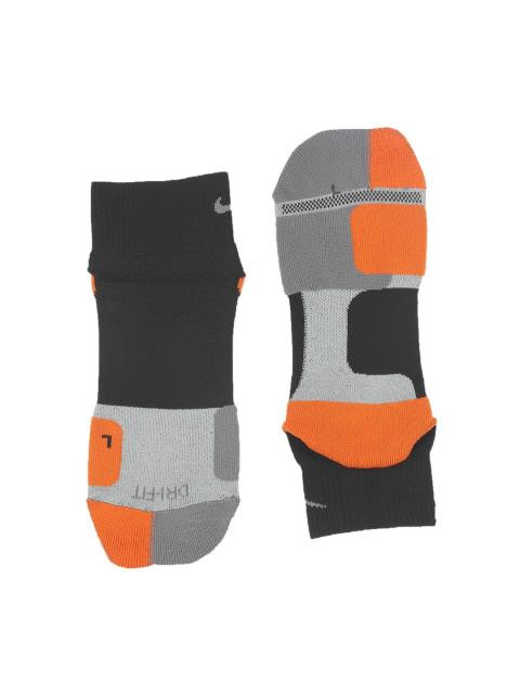 Grey and orange soccer socks, made of a polyester-nylon-spandex mix fabric, with Dri-Fit and nike Swift technologies and arch compression