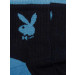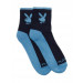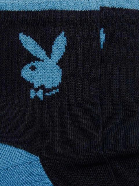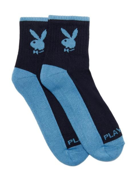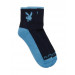 Navy blue and light blue socks, ribbed mouth, branding at the forefoot and on the collar, and padded footbed