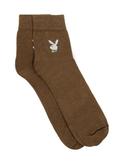 Brown socks, has branding near the ankle, elasticated cuffs for a firm grip and sanitised to keep it hygienic, fresh and unpleasant odours away