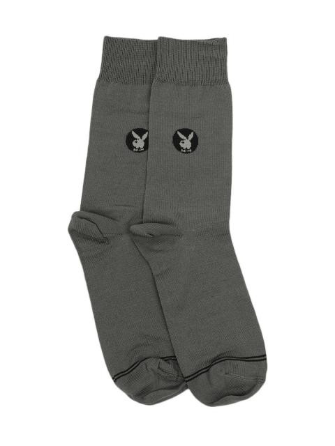 Grey, above ankle length socks with striped detail at the toe region, elasticated and ribbed cuffs with branding below it on both sides