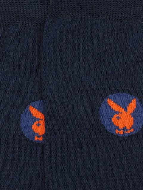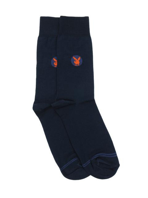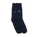 Navy blue, above ankle length socks with striped detail at the toe region, elasticated and ribbed cuffs with branding below it on both sides