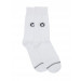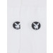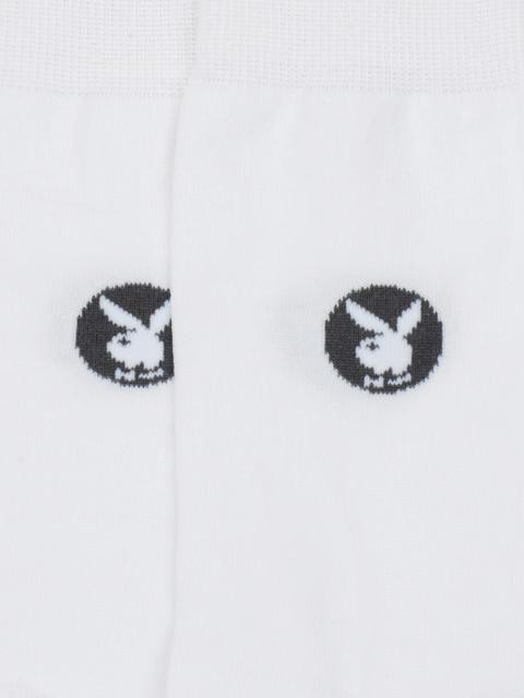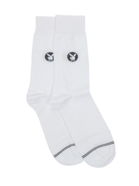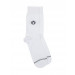 White, above ankle length socks with striped detail at the toe region, elasticated and ribbed cuffs with branding below it on both sides