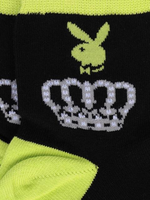 Brand bunny design and a crown pattern on the sock with dark contrast colouring at the toe, heel cup and cuff