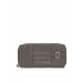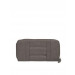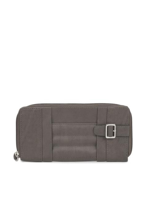 Brownish grey wallet crafted from synthetic leather with a strap and buckle detail on the front