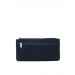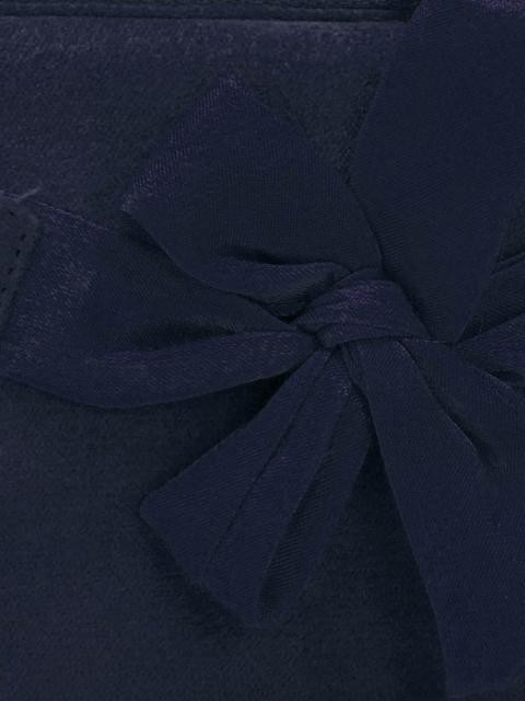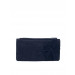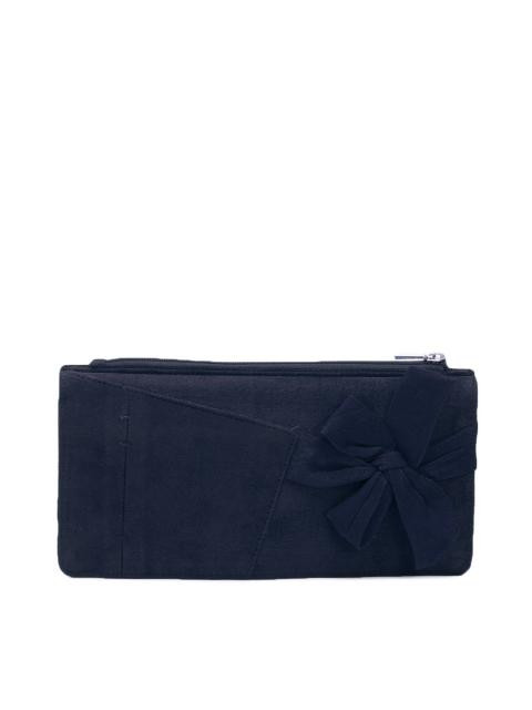 Navy blue wallet with single fold crafted from synthetic leather and fabric with a bow detail on the front
