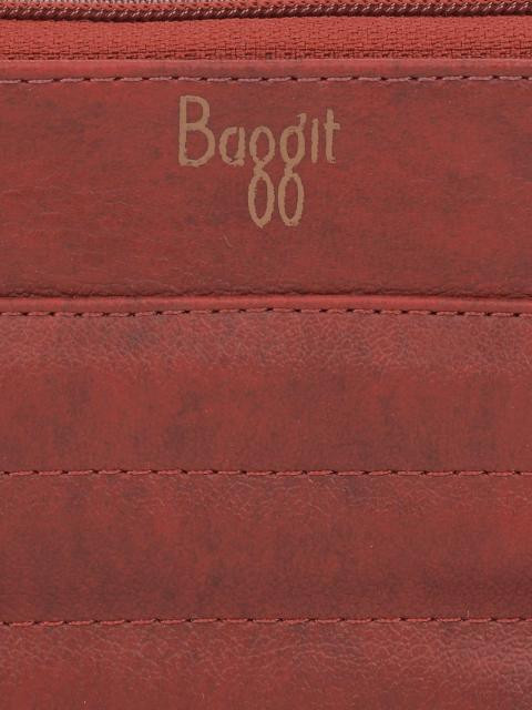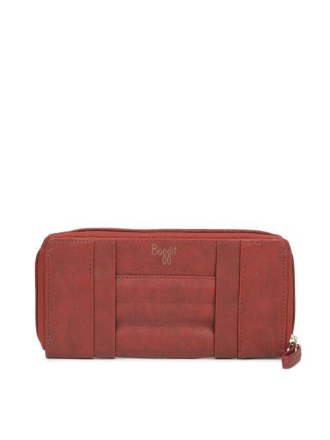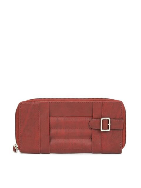Red wallet crafted from synthetic leather with a strap and buckle detail on the front
