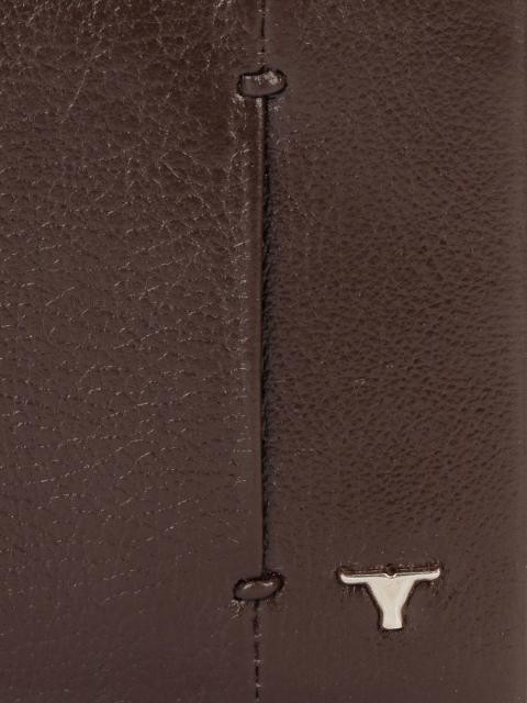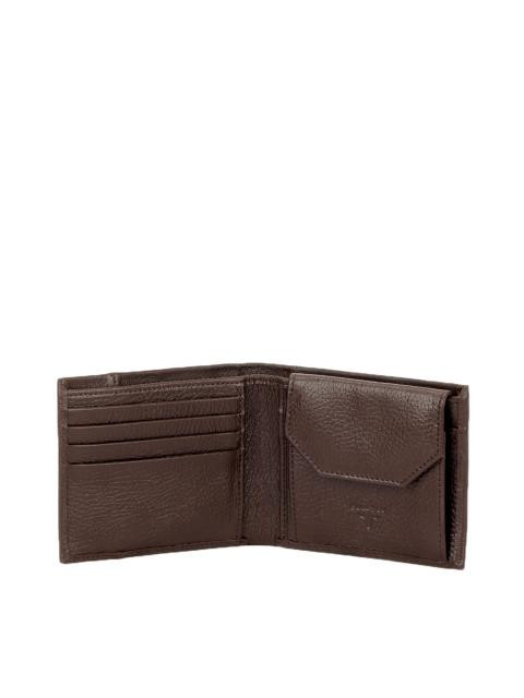 Brown leather wallet with paneled front with metal branding