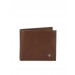 Brown wallet with a leather upper, has branding at the bottom corner in the front