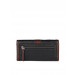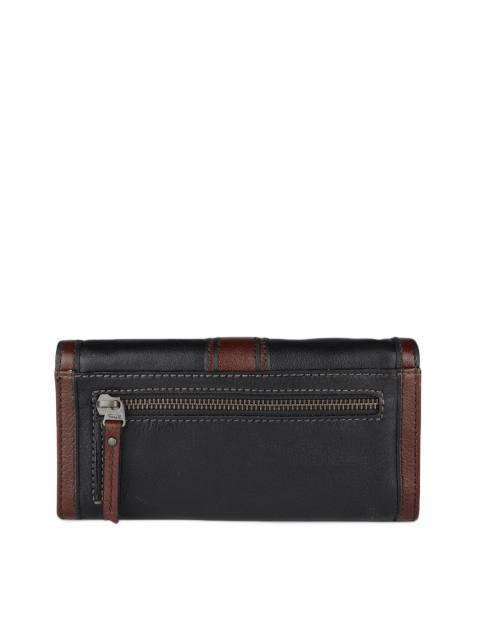 Brown and black tri fold wallet with a flap and click clasp closure, that has a zipped compartment, an inner pocket with four card holders on the left, two insert pockets with seven card holders and one id card holder on the right, zipped pocket at the back, stitch detailing and brand name on the click closure