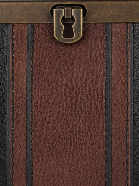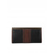 Black wallet that has a metallic push up clasp, inner zipped pocket, one insert pocket and six card holders on one side of the zipped pocket, two insert pockets and six card holders on the other side, stitch detailing and brand name on a metallic rim on the mouth of the wallet