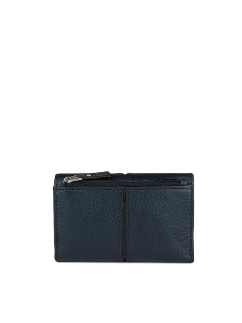 Blue four-fold wallet with a flap with press button closure, two main compartments, multiple card slots, three insert pockets, an ID card holder, zipped pocket at the back, stitch detailing and brand name on a metallic badge with a keyhole design on the front