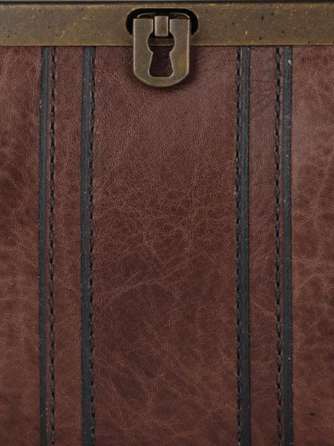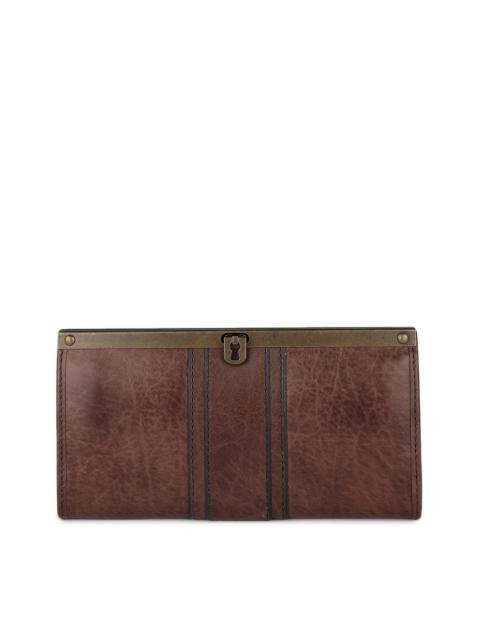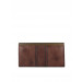 Brown wallet that has a metallic push up clasp, inner zipped pocket, one insert pocket and six card holders on one side of the zipped pocket, two insert pockets and six card holders on the other side, stitch detailing and brand name on a metallic rim on the mouth of the wallet