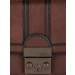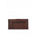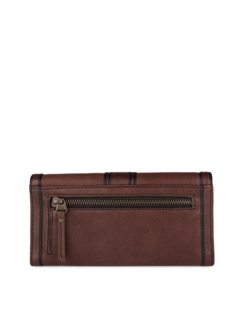Brown and black tri fold wallet with a flap and click clasp closure,  that has a zipped compartment, an inner pocket with four card holders on the left, two insert pockets with seven card holders and one id card holder on the right,  zipped pocket at the back, stitch detailing and brand name on the click closure
