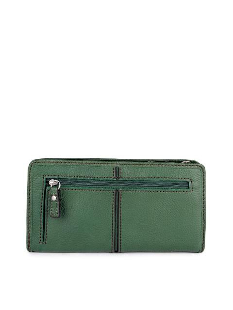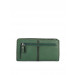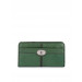 Green wallet that has a zipped closure, inner zipped pocket in the middle with an id card holder, two insert pockets and six card holders on either sides, zipped pocket at the back, insert pocket on the front with a metallic keyhole detail with branding and stitch detailing