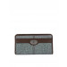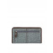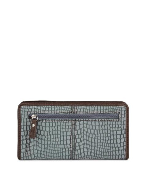 Grey and brown wallet that has a textured look, zipped closure, an inner zipped pocket in the middle, one insert compartment on either sides with six card holders, zipped pocket at the back, stitch detailing and brand name embossed on the front