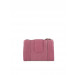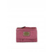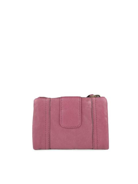 Raspberry three-fold wallet with a zipped pocket, flap with a press button closure, has one main compartment, eight card holders with two insert pockets, an inner zipped pocket with four card holders on one side and an id card holder on the other side, a buttoned pocket on the front with branding on a metallic badge and stitch detailing