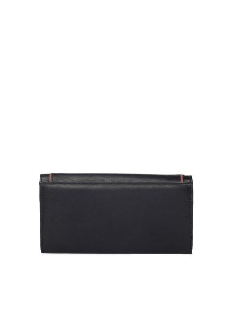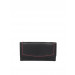Black wallet with pink piping has a buttoned flap to secure the wallet