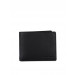 Black leather wallet with two main compartments, has two card holders, two slip pockets, one coin holder and embossed branding on the front