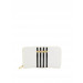 White wallet with a textured, dotted exterior, golden coloured brand badge in front and four black coloured stitched stripes