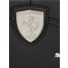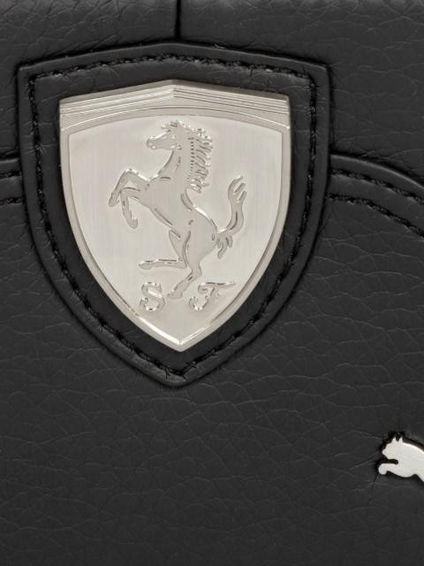 Black wallet with ferrari logo  in the centre and Puma logo on the right, two main compartments and one coin press button compartment, multiple card holders for convenience