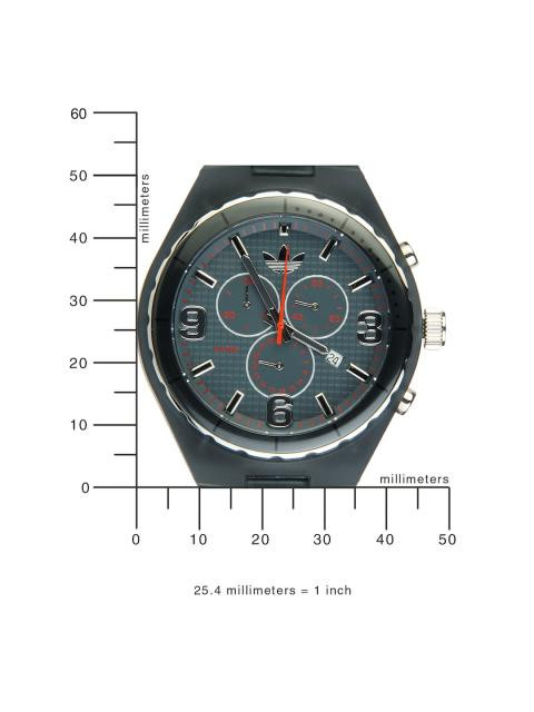 Features: A screw to reset the time, three-faced chronograph display, two push-buttons to adjust settings, a date aperture