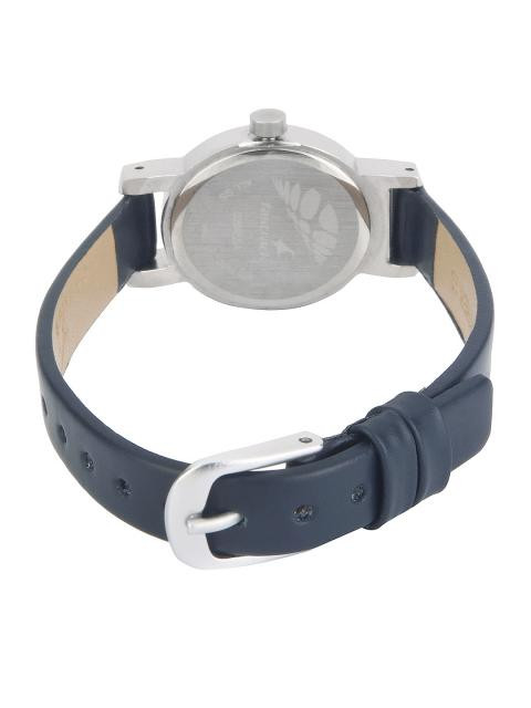Strap style: Navy blue leather strap secured with a tang clasp, has two loops to hold the tail in place