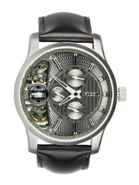 Dial style: Grey dial with partially exposed mechanics, has hour and minutes hands, markings