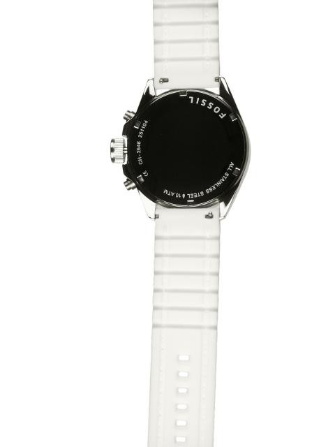 Case style: Analogue watch with a stainless steel case and a fixed bezellt;brgt;Dial style: Brown dial with glow-in-the-dark markings and three handslt;brgt;Features: A screw to reset time, a date aperture, 3 subdials for date, day and hour display, two push buttons to adjust features like alarm and timerlt;brgt;Strap style: White silicone strap secured with a tang clasp