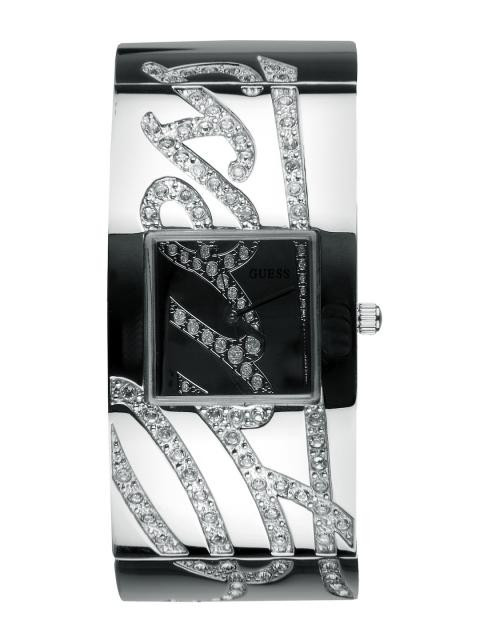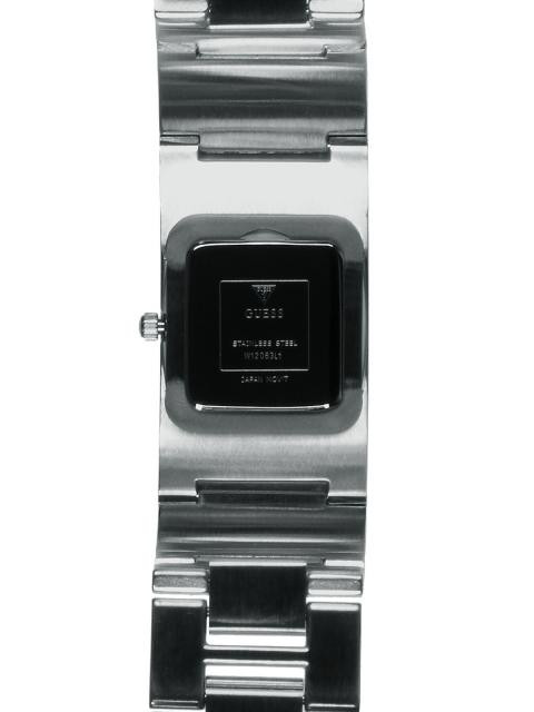 GUESS logo in Swarovski crystals encrusted on the metal strap and dial