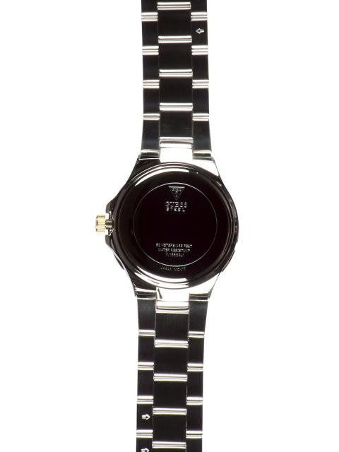 Stainless steel case with a fixed bezel and crystal embellishments with a two tone steel strap