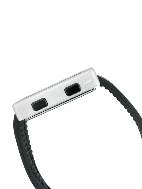 Digital dial showing hours, minutes, seconds, month, date, weekday, chronograph, lap recall and light