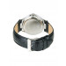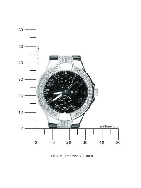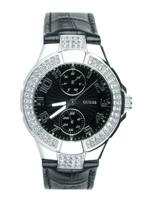 Stainless steel case with a fixed bezel and crystal embellishments with a black leather strap