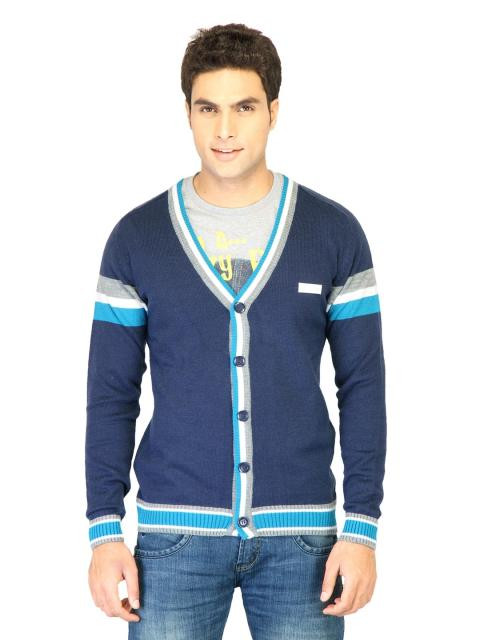 Navy blue knit cardigan made of 80% acrylic and 20% wool, has long sleeves with rubbed cuffs, V-neckline with a front buttoned placket, brand tab appliqued on the upper left chest, three colour stripe on the ribbed placket, hemline and cuffs, three stripe detailing on the sleeve cuffs and ribbed hemline