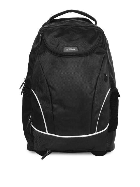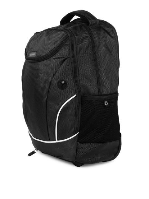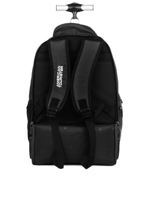 Pullable trolley handle concealed with a zipped flap on the top of the bag and wheels at the base at the back, also has two support structures at the base
