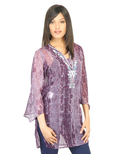Wear your art on the go and flaunt your ethno-modern sense of style with ease by slipping into this kurti from aneri. The flow georgette fabric offers exemplary comfort, while the heavily beaded yoke and drop waist heighten the fashion statement of this kurti. Team it with jeans and chunky earrings.