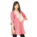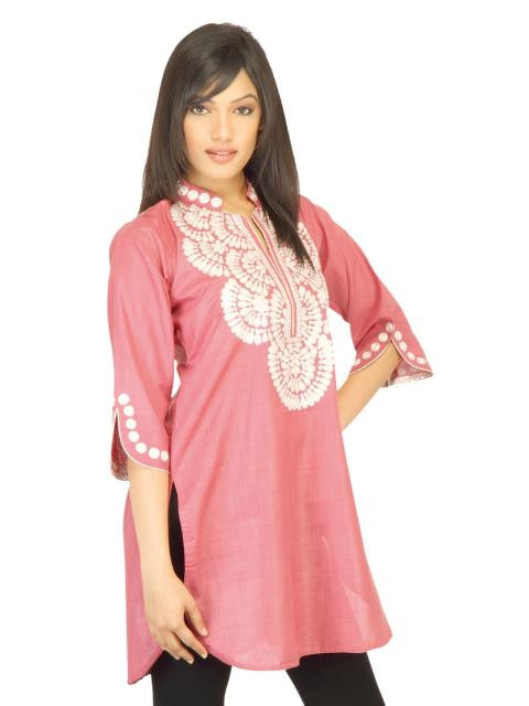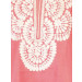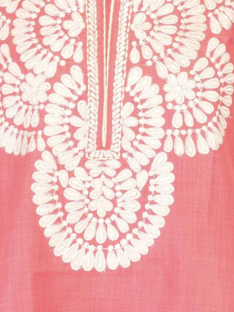 Pink kurta made of a blended fabric, has a heavily embroidered yoke, mandarin collar with a V-neck, three-quarter sleeves with rounded slit cuffs hems and has embroidery and silver striped inner lining, with a vented hem