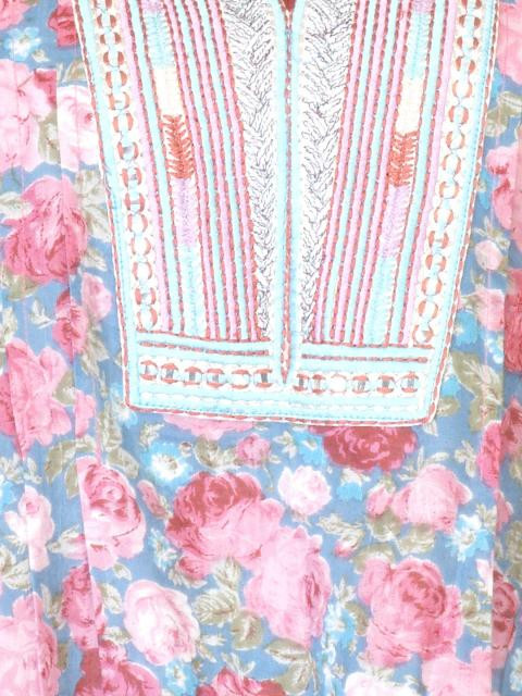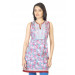 Blue and pink sleeveless printed kurta made of 100% cotton, has a round neck with a split neckline, pintucks at the shoulder that flare at the waist and an embroidered yoke