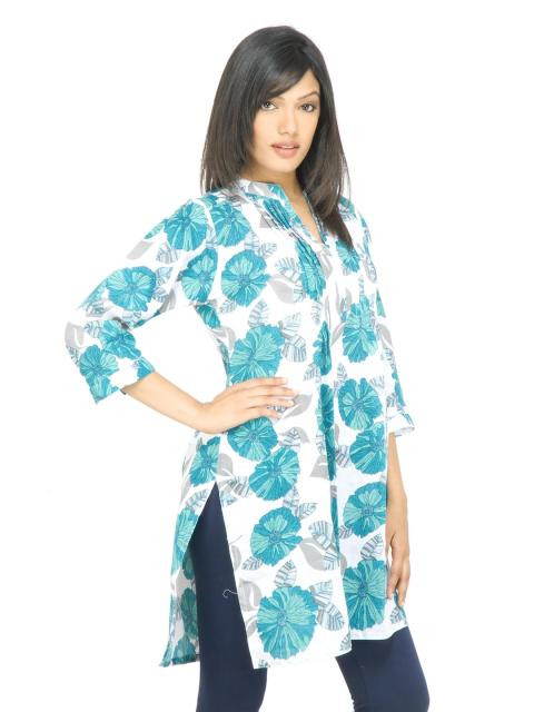 White and green printed kurta made of 100% cotton, has a mandarin collar with a split neckline, pintucks on the shoulder that flare at the waist, three quarter sleeves and a vented hem