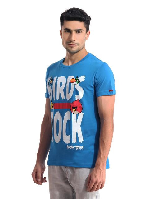 Blue round neck T-shirt made of 100% cotton, has short sleeves and print on the front