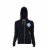 Black V-neck top with satiny trims along the neck and placket region, short sleeves with slits on top and a curved and vented hem