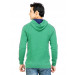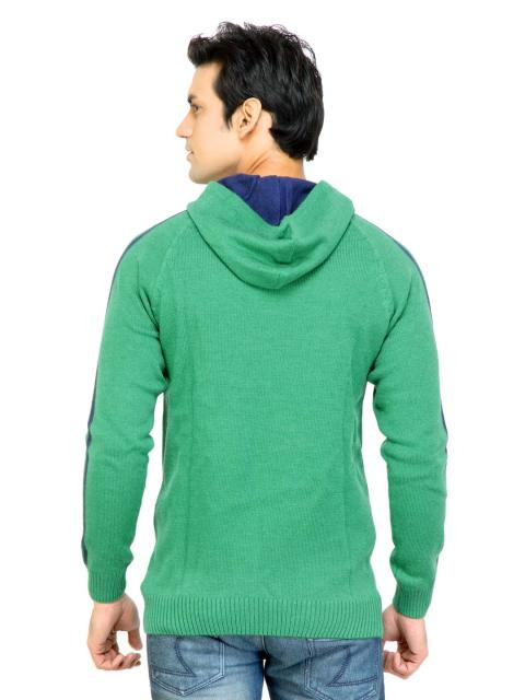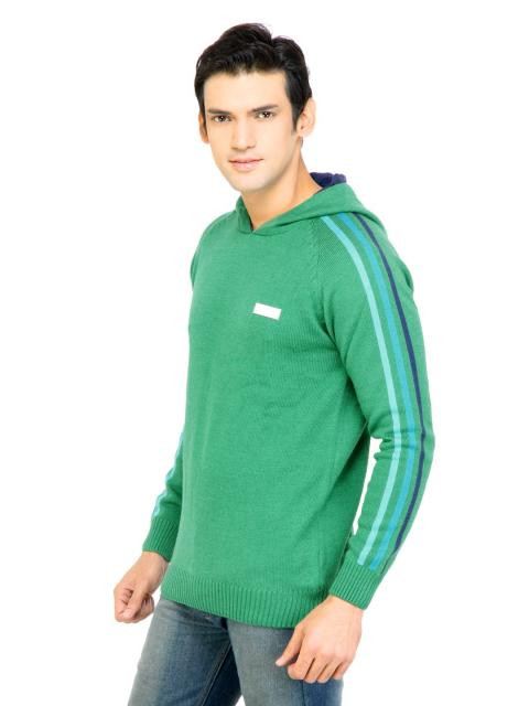 Green hooded pullover made of 80% acrylic and 20% wool, has long raglan sleeves, ribbed cuffs and hem, adidas patented 3-Stripes from the shoulders to the cuffs, and brand badge on the left chest