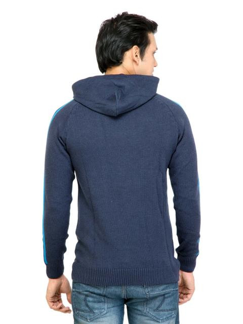 Navy blue hooded pullover made of 80% acrylic and 20% wool, has long raglan sleeves, ribbed cuffs and hem, adidas patented 3-Stripes from the shoulders to the cuffs, and brand badge on the left chest