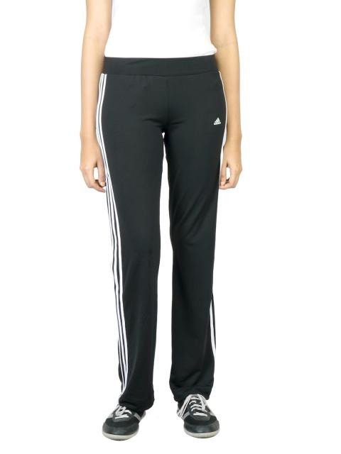Black trackpants made of 92% polyester and 8% lycra, with broad elasticated waistband, adidas 3-Stripes in white tape down each outside leg, adidas logo printed on upper leg