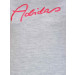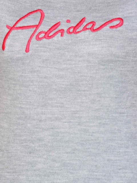 This grey sweater has a round neck, long raglan sleeves in pink, ribbed cuffs and hem, and embroidered brand name on the chest
